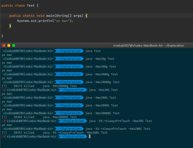 This works in the same way with a caveat that the JVM touches all the pages in the initialization phase of application. Apparently, this works in Mac, somehow MacOS gives 20GB memory to JVM (See image below). But when I run this with -Xms200G, it stops working in MacOS too. Now the question is how does prefaulting 20G memory in MacOS works. This might give you some idea.