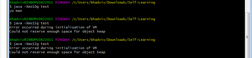This means that the JVM wants 20G memory, what happens after this is OS dependent, Windows is reserving the virual memory and mapping that virual memory to the physical memory. In above case, I have 10G free RAM so the program runs, but when I set Xms value to 12G, it doesn’t work because the system doesn’t have 12G physical memory to provide to the JVM. However in case of Mac, it reserves the virtual memory for JVM without mapping it to physical memory.